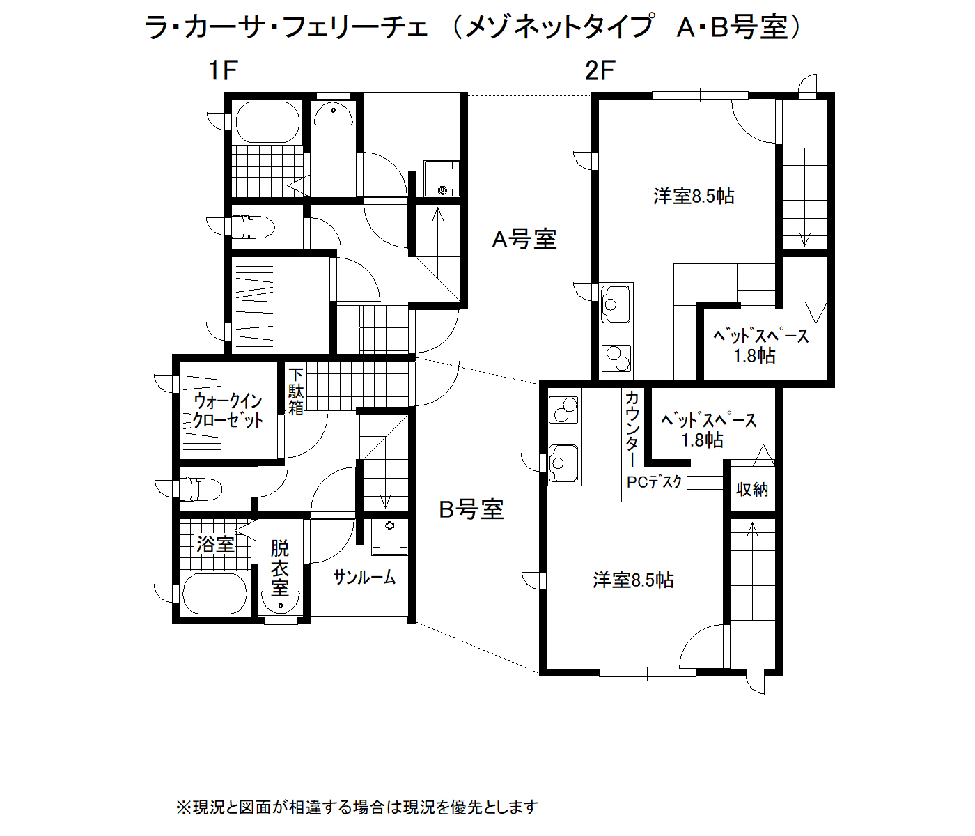 1F:トイレ・浴室・脱衣室・WIC・サンルーム 2F:洋室+キッチン(8.5)、ベッドスペース(1.8帖) |